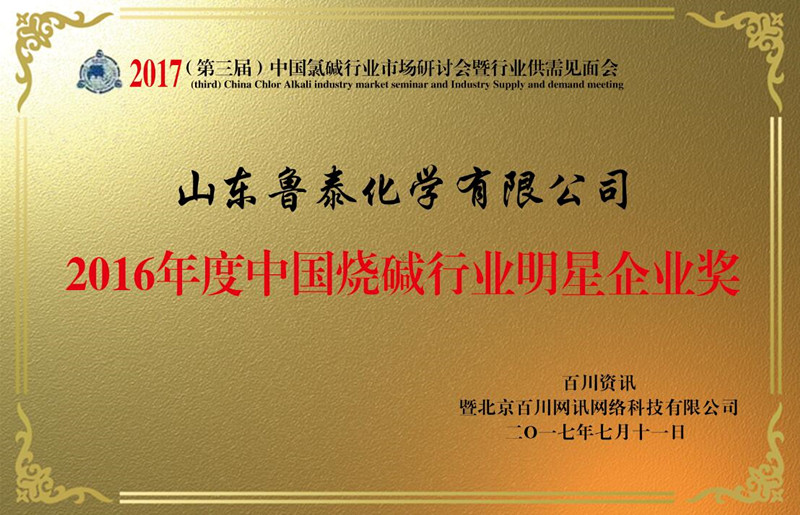 鲁泰化学:荣获“2016年度中国烧碱行业明星企业奖”荣誉称号